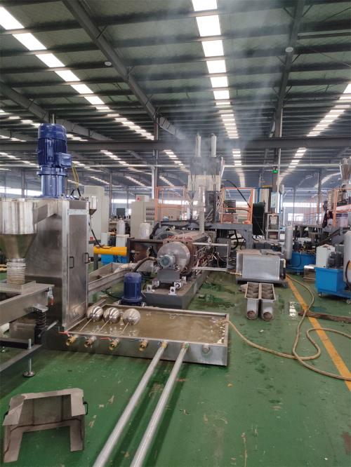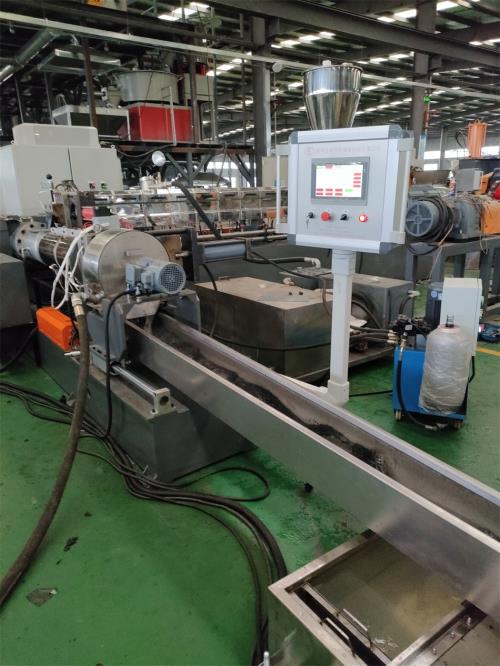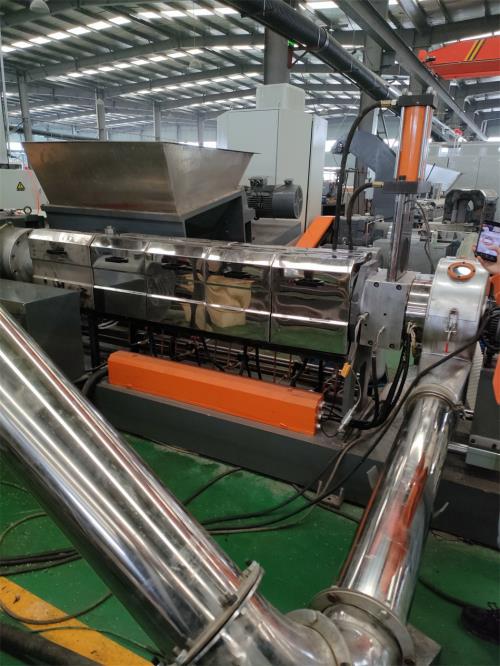 采用YA-N46抗磨46#液壓油;(油品需客戶自行采購)6、拉條機(jī)頭裝置:1) 熱電偶與壓力傳感器分開安裝,分別用于檢測溫度和壓力(三)水拉條輔機(jī) 1)水槽:一臺,L=6米,加寬加深,槽體為不銹鋼材質(zhì);水槽與吸干機(jī)過度體一件;不銹鋼材質(zhì),水槽熱水經(jīng)過濾器到環(huán)保型冷卻器;水槽架里安裝:4組環(huán)保風(fēng)冷卻系統(tǒng)(環(huán)保型:發(fā)明專利號:CN201911312134.6)不需要接外循環(huán)水冷卻,不用徘外水;采用閉環(huán)循環(huán)系統(tǒng);2)振動甩干機(jī),功率1.5kw;與物料接觸件均為不銹鋼材質(zhì)。3)吹干機(jī):一臺,功率2.2kw;與物料接觸件均為不銹鋼材質(zhì)。 4)龍門切粒機(jī):壹臺,功率4kw,變頻調(diào)速;切粒機(jī)動刀刀口采用鎢鋼材質(zhì)(切粒機(jī)刀口采用平口式)5)加長振動篩:單螺桿造粒機(jī)一臺,L=2.5m,電機(jī)采用:震動專用電機(jī);震動量可以調(diào)節(jié)大小:電機(jī)功率率:0.55KW兩臺;振動篩篩網(wǎng)采用三層分離物料;大孔直徑φ8mm,小孔直徑φ2.5mm,不銹鋼材質(zhì),振動篩出廠時;振動量調(diào)節(jié)到最小;6)風(fēng)吹料倉:一套,1m料倉一件,不銹鋼材質(zhì);采用φ130mm不銹鋼管聯(lián)接;3kw物料輸送風(fēng)機(jī)。聚烯烴無鹵造粒機(jī) http://m.giftmallplus.com/contents/59/134.html