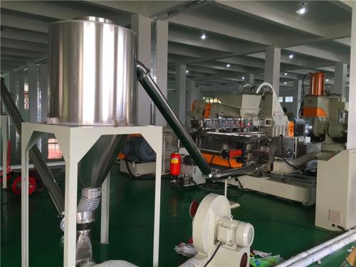 不銹鋼材質(zhì);3) 加熱區(qū)段:采用優(yōu)質(zhì)鑄鋁加熱器6、水冷卻系統(tǒng)1)水泵泵電機(jī)功率:3kw;自動(dòng)控水電磁閥;手動(dòng)閥用銅閘閥控制;加大水流量,2)采用環(huán)保風(fēng)冷卻系統(tǒng)(環(huán)保型:發(fā)明專利號(hào):CN201911312134.6)不需要接外循環(huán)水冷卻7、液壓板式換網(wǎng):通水冷卻系統(tǒng)1)換網(wǎng)器,板式過濾自動(dòng)換網(wǎng)器,流量截面為圓形;低煙無鹵造粒機(jī)_省電20%_佳德塑機(jī)2)液壓缸、液壓站等一套,采用YA-N46抗磨46#液壓油;(油品需客戶自行采購)8、機(jī)頭裝置:1) 熱電偶與壓力傳感器分開安裝,分別用于檢測(cè)溫度和壓力(七)風(fēng)冷模面熱切輔機(jī)系統(tǒng)1)風(fēng)冷模面熱切造粒機(jī):4級(jí)電機(jī),功率1.5 kw;熱切刀一套、電機(jī)聯(lián)軸器一件,采用4把刀片切粒調(diào)速控制:采用“三晶或羅賓漢”變頻調(diào)速器2)切粒罩:對(duì)吹式,不銹鋼材質(zhì);一件;床身與切粒罩為整體式;推拉式結(jié)構(gòu);帶剎車裝置;熱切罩與機(jī)頭分離開有足夠空間;操作方便3)一級(jí)旋風(fēng)分離器:φ600mm,不銹鋼材質(zhì);一件;采用φ130mm不銹鋼管聯(lián)接;連接方式:5.5kw物料輸送風(fēng)機(jī);4)二級(jí)旋風(fēng)分離器:φ600mm,不銹鋼材質(zhì);一件;采用φ130mm不銹鋼管聯(lián)接,4kw物料輸送風(fēng)機(jī);5)加長(zhǎng)振動(dòng)篩:一臺(tái),L=2.5m,電機(jī)采用:震動(dòng)專用電機(jī);震動(dòng)量可以調(diào)節(jié)大小:電機(jī)功率率:0.15KW兩臺(tái);振動(dòng)篩篩網(wǎng)采用三層分離物料;大孔直徑φ8mm,小孔直徑φ2.5mm,不銹鋼材質(zhì),6)三級(jí)旋風(fēng)分離器:φ600mm,不銹鋼材質(zhì);一件;采用φ130mm不銹鋼管聯(lián)接;連接方式:5.5kw物料輸送風(fēng)機(jī);低煙無鹵造粒機(jī)_省電20%_佳德塑機(jī)7)風(fēng)吹成品料倉:一套,1m料倉一件,不銹鋼材質(zhì);采用φ130mm不銹鋼管聯(lián)接;4kw物料輸送風(fēng)機(jī);